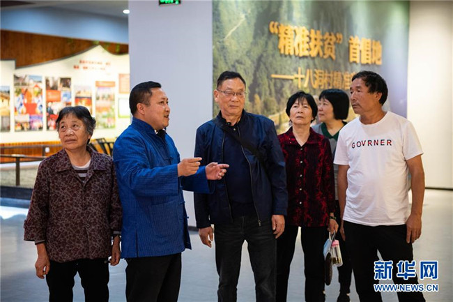 5月15日,在湘西十八洞村精準(zhǔn)扶貧展示廳,麻輝煌(左二)向游客講解村史。新華社發(fā)(陳思汗攝)