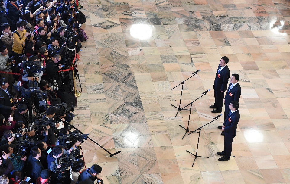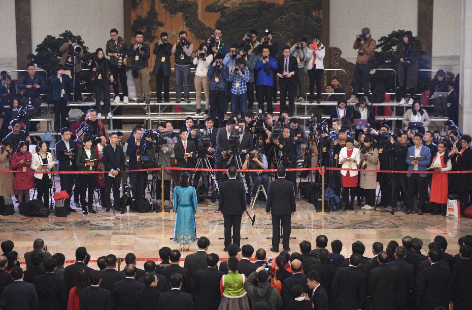 2018年3月20日,十三屆全國人大一次會議在北京人民大會堂舉行閉幕會。這次全國兩會首設(shè)“代表通道”,圖為記者在“代表通道”采訪。