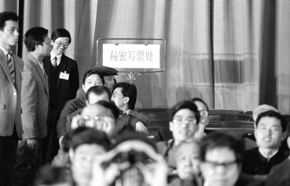 1988年4月,七屆全國人大一次會議第六次全體會議,投票選舉國家機構(gòu)領(lǐng)導人。圖為首次設(shè)立的秘密寫票處。