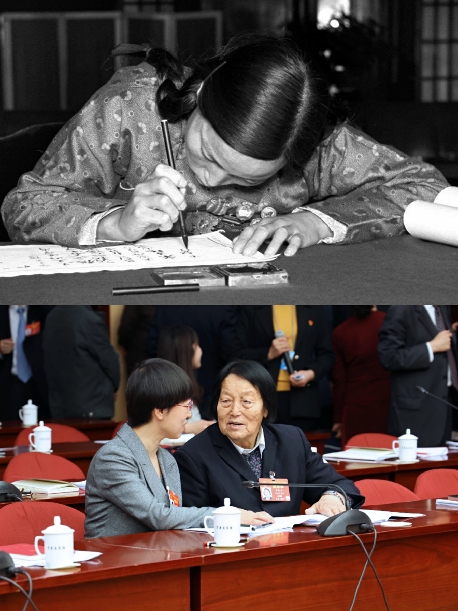 申紀蘭用她半生時間見證了中國民主法制建設(shè)的進程。上圖為出席第一屆全國人民代表大會第一次會議的人大代表申紀蘭在報到(1954年9月攝);下圖為她(右)在十三屆全國人大二次會議山西代表團會議間隙與青年代表交流(2019年3月攝)。
