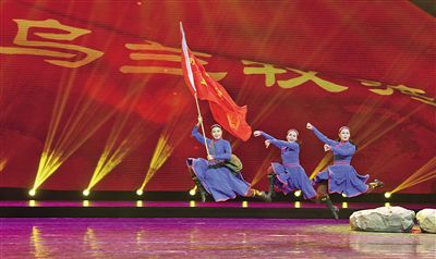 蘇尼特右旗烏蘭牧騎隊員演出《一支輕騎兵從這里出發(fā)》。 記者 王磊 攝