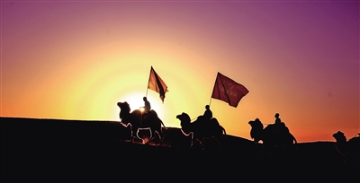 行走在大漠夕陽下的駝背宣講團。記者 馬建荃 攝