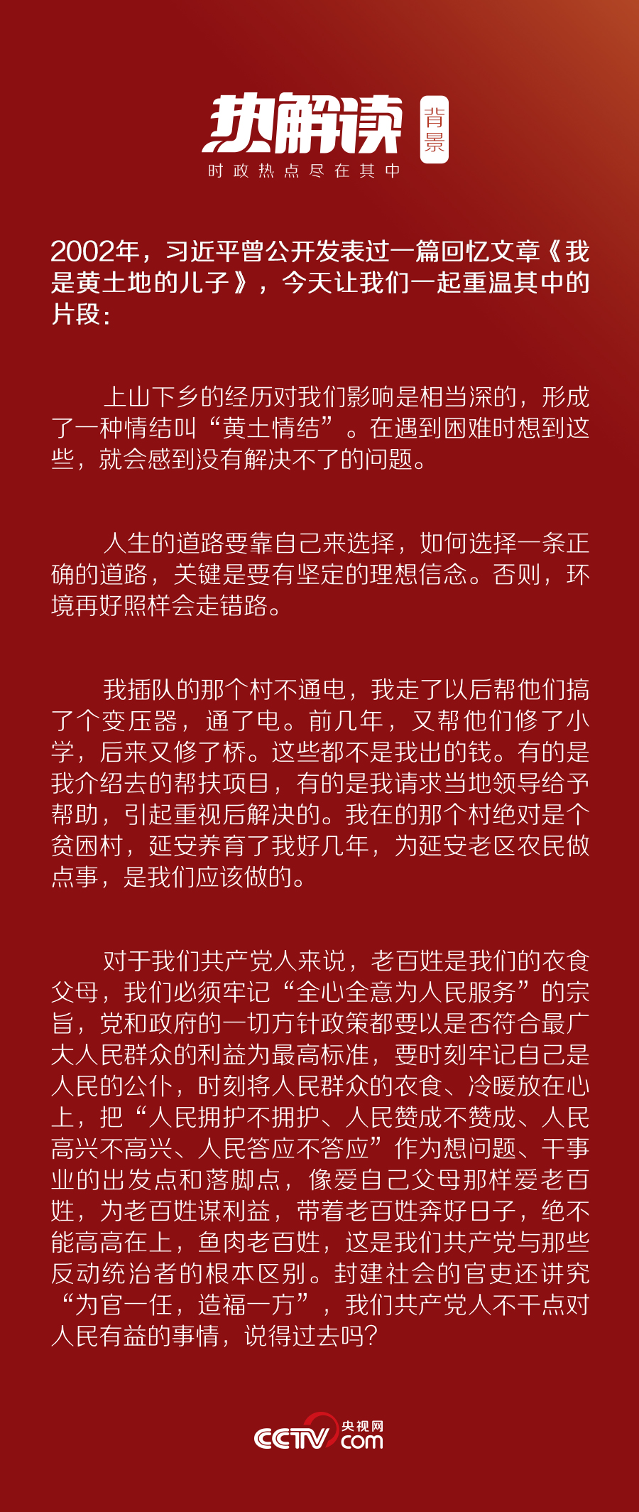 早在十幾年前,習(xí)近平就曾在《我是黃土地的兒子》一文中提到過“情結(jié)”二字。他說,上山下鄉(xiāng)的經(jīng)歷對我們影響是相當(dāng)深的,形成了一種情結(jié)叫“黃土情結(jié)”。
