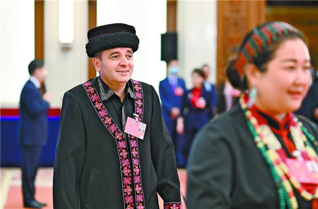 5月24日,全國政協(xié)十三屆三次會議第二場“委員通道”采訪活動舉行。這是全國政協(xié)委員玉克賽克·西加艾提接受完采訪離開“委員通道”。 新華社記者 劉金海攝