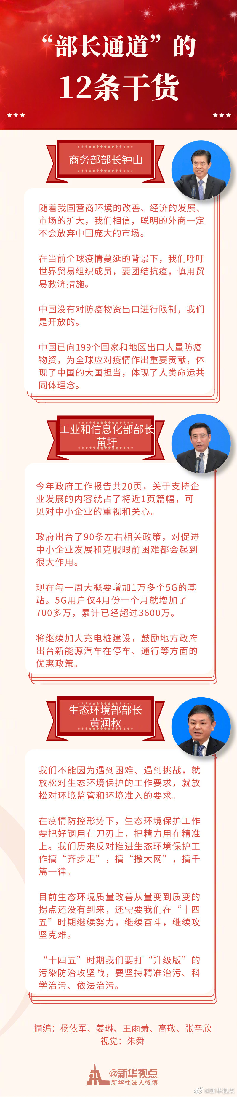 5月25日,商務(wù)部部長(zhǎng)鐘山、工業(yè)和信息化部部長(zhǎng)苗圩、生態(tài)環(huán)境部部長(zhǎng)黃潤(rùn)秋亮相全國(guó)兩會(huì)“部長(zhǎng)通道”。新華視點(diǎn)微博為你總結(jié)了12條干貨,請(qǐng)看↓ ​​​​