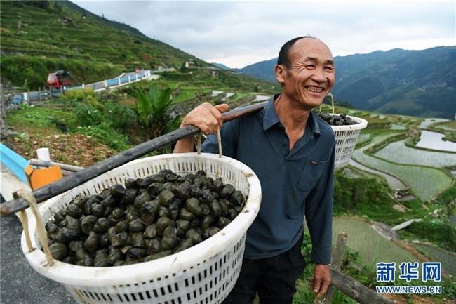 5月26日,貴州省從江縣加榜鄉(xiāng)加車村的村民在搬運(yùn)種螺。