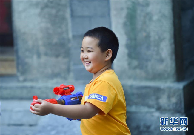 5月31日,小朋友在北京鐘鼓樓文化廣場(chǎng)玩耍。新華社發(fā)(陳鐘昊攝)