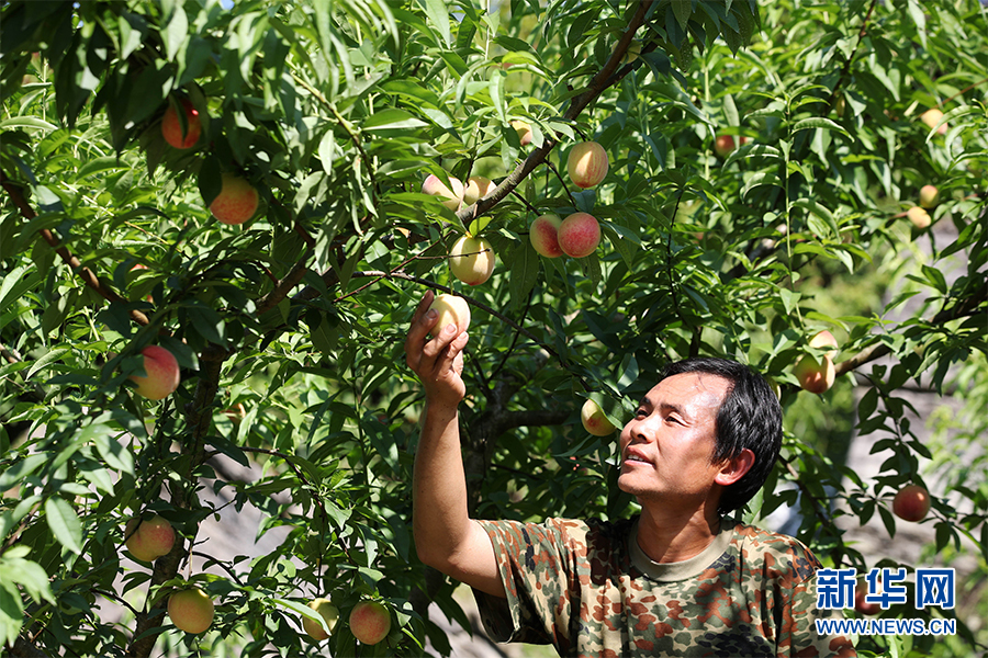 重慶市黔江區(qū)黑溪鎮(zhèn)蘇維村村民龐春武正在采摘桃子。新華網(wǎng)發(fā)(楊敏 攝)