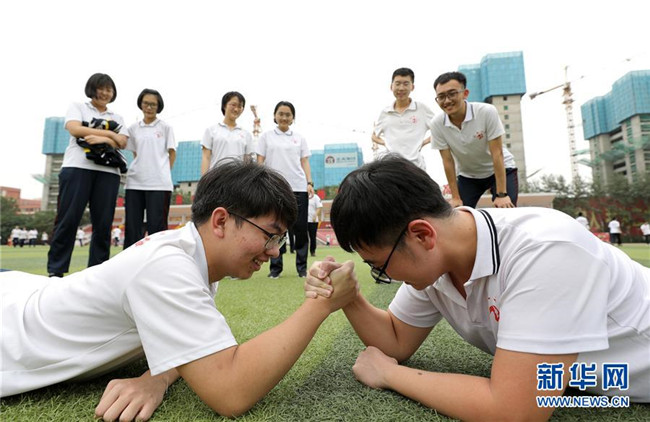 6月9日,河北省衡水市第二中學(xué)的高三學(xué)生在操場進(jìn)行掰手腕比賽。 新華社記者 朱旭東 攝