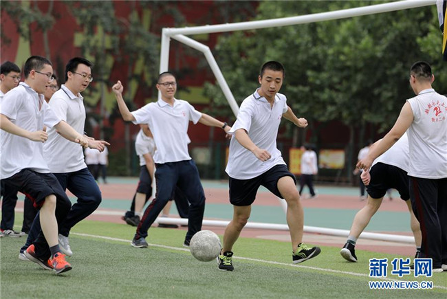6月9日,河北省衡水市第二中學(xué)的高三學(xué)生在操場上踢足球。新華社記者 朱旭東 攝