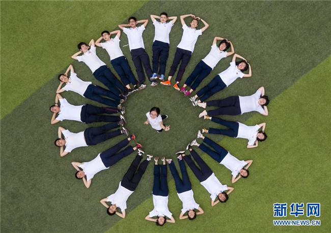 6月9日,河北省衡水市第二中學(xué)的高三學(xué)生在操場上參加減壓趣味游戲(無人機(jī)照片)。新華社記者 朱旭東 攝