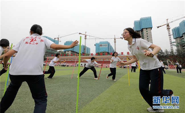 6月9日,河北省衡水市第二中學(xué)的高三學(xué)生在操場上參加減壓趣味游戲。新華社記者 朱旭東 攝