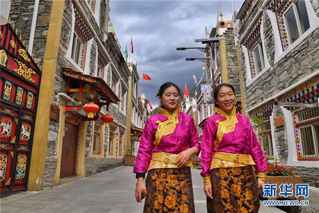 6月11日,同是經(jīng)營(yíng)民宿客棧的四川省阿壩藏族羌族自治州理縣古爾溝鎮(zhèn)丘地村村民拉姆(左)和汪乃前往村口迎接客人。新華社記者 劉坤 攝