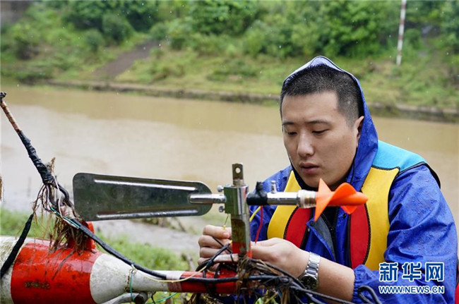 7月1日,在永川區(qū)臨江河來蘇水文站,站長鐘睿在安裝調(diào)試流速儀。新華社記者 劉潺 攝