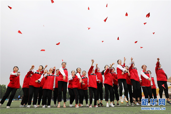 2020年7月3日,河南省溫縣一中高三學生在學校操場上做減壓游戲。 2020年全國高考即將拉開帷幕,同學們從容應對,以良好的狀態(tài)迎接高考的到來。 新華社發(fā)(徐宏星 攝)