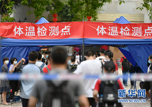 7月7日,在福州第二中學(xué)考點,考生進(jìn)入考場前有序通過體溫檢測點。 當(dāng)日,2020年高考拉開帷幕。 新華社記者 魏培全 攝