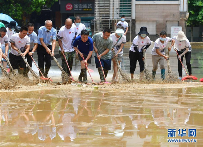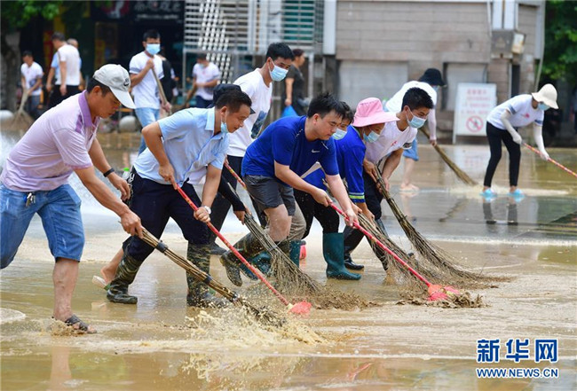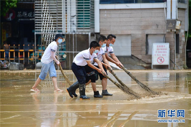 7月12日,融水苗族自治縣文化體育廣電和旅游局清淤小分隊(duì)在蘆笙廣場(chǎng)清理地面。 新華社記者 黃孝邦 攝