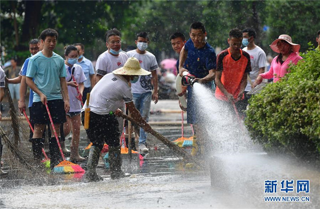 7月12日,融水苗族自治縣文化體育廣電和旅游局清淤小分隊(duì)在蘆笙廣場(chǎng)清理地面。新華社記者 黃孝邦 攝