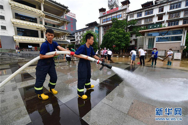 7月12日,融水消防救援大隊(duì)的消防隊(duì)員在蘆笙廣場(chǎng)沖洗地面。 新華社發(fā)(唐鵬程 攝)