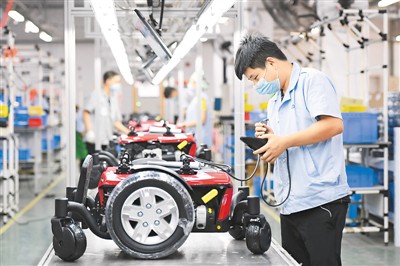 近來,江西省豐城市外貿(mào)企業(yè)通過與電商平臺合作、云推介等方式促進(jìn)企業(yè)穩(wěn)產(chǎn)增效。圖為豐城市捷和電機(江西)有限公司員工在生產(chǎn)線上組裝電動輪椅車,準(zhǔn)備出口至歐洲、中東、非洲等地市場。周 亮攝(人民視覺)