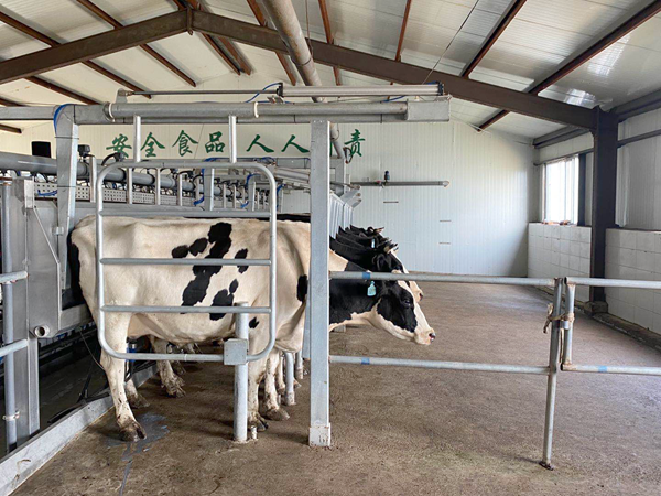 奶牛每天需要擠奶2到3次。牧場(chǎng)的每個(gè)牛舍里,都配有1個(gè)擠奶廳,奶牛吃完飼料,直接就可以到擠奶廳擠奶。