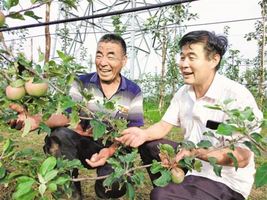 看著自家地里的蘋(píng)果長(zhǎng)勢(shì)旺盛,楊天軍(左一)按捺不住心中的喜悅。本報(bào)記者 高山攝