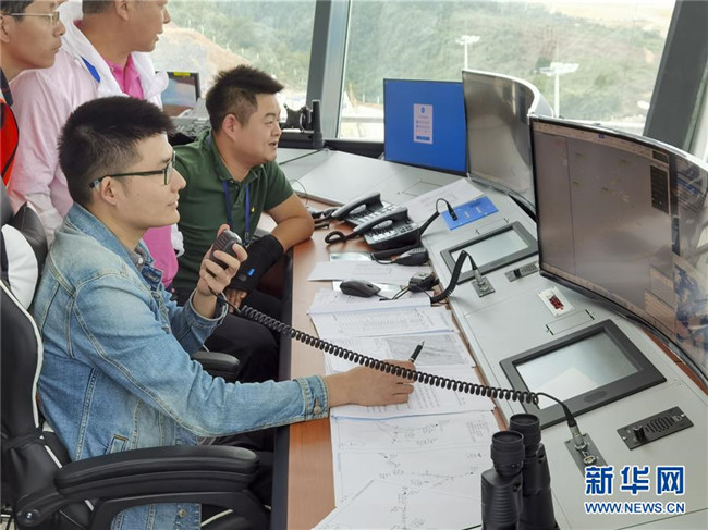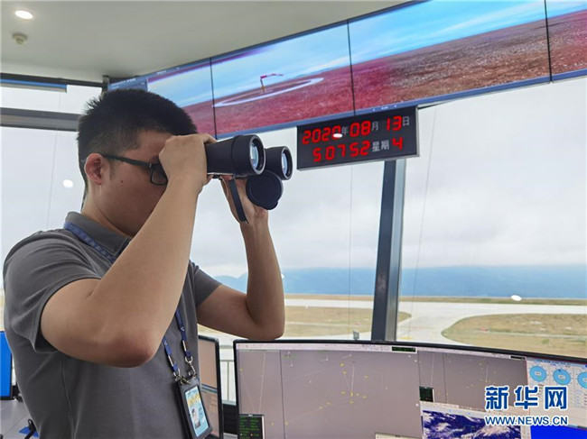 8月13日,參加校飛的地面工作人員在仙女山機(jī)場的塔臺(tái)工作區(qū)內(nèi)工作。 新華社記者 劉潺 攝
