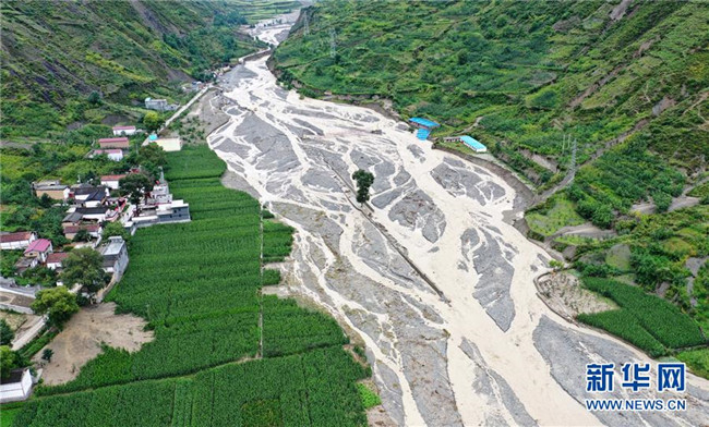 這是8月23日拍攝的舟曲縣被毀農(nóng)田和道路(無人機照片)。 新華社記者 郎兵兵 攝