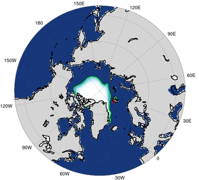 ▲中科院大氣物理研究所ANSO IAP-LASG北極海冰動力集合預(yù)測系統(tǒng)6月份發(fā)布的9月份北極海冰范圍預(yù)測,綠色實(shí)線為預(yù)測的北極海冰范圍,白色區(qū)域?yàn)楹1鶇^(qū)域。圖片來源:中國科學(xué)報(bào)