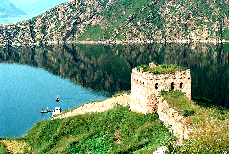 潘家口水庫(kù)“水下長(zhǎng)城”,一船只從城墻邊駛過(攝于2012年)。新華社發(fā)(朱建軍 攝)