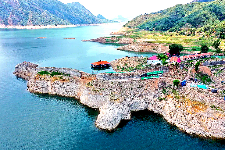 戚輝介紹,由于水庫(kù)位于燕山山脈沉降地帶東南構(gòu)造帶與華夏構(gòu)造帶的復(fù)合部位,地質(zhì)構(gòu)造復(fù)雜,四周的石灰?guī)r、白云巖及少部分頁(yè)巖巖體,由于流水侵蝕與褶皺斷裂作用,塑造出一系列奇峰怪石與陡崖懸壁,是北國(guó)極為罕見的山水風(fēng)光。