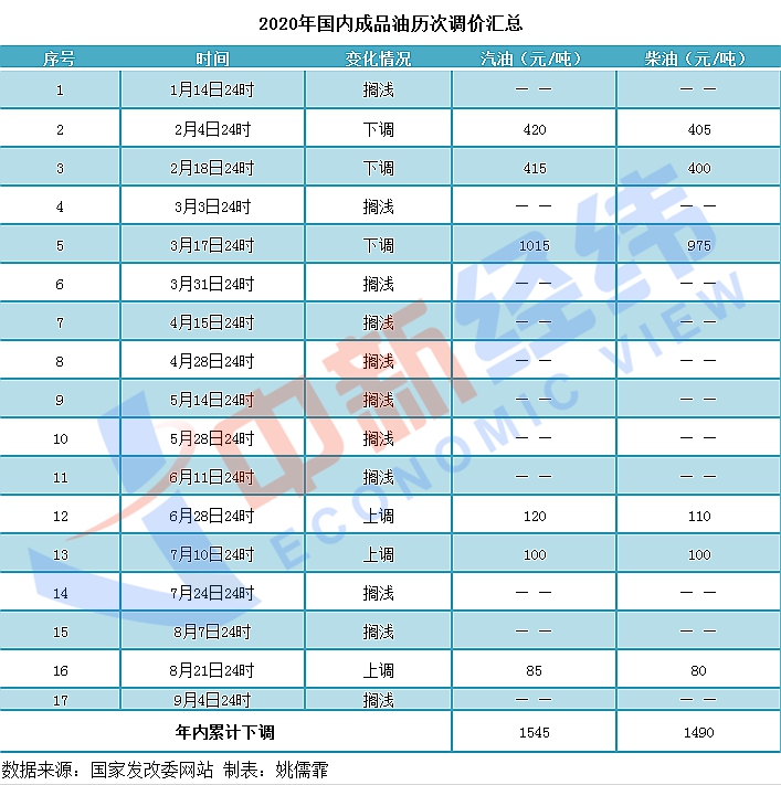 據(jù)中新經(jīng)緯客戶端統(tǒng)計(jì),2020年以來(lái)國(guó)內(nèi)成品油調(diào)價(jià)已進(jìn)行了十七輪,具體為上調(diào)三次、下調(diào)三次,擱淺十一次,汽油總計(jì)下調(diào)了1545元/噸,柴油總計(jì)下調(diào)了1490元/噸。其中,3月31日至6月11日的6輪調(diào)整均因國(guó)際市場(chǎng)原油價(jià)格低于40美元/桶而擱淺。如果本輪成品油調(diào)價(jià)下調(diào),2020年國(guó)內(nèi)成品油調(diào)價(jià)將呈現(xiàn)“三漲四跌十一擱淺”的格局。