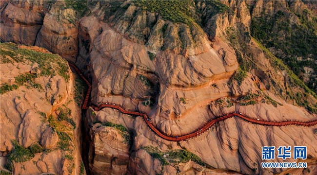 游人在靖邊縣龍洲鎮(zhèn)波浪谷丹霞景區(qū)游覽(9月24日攝,無(wú)人機(jī)照片)。新華社記者 陶明 攝