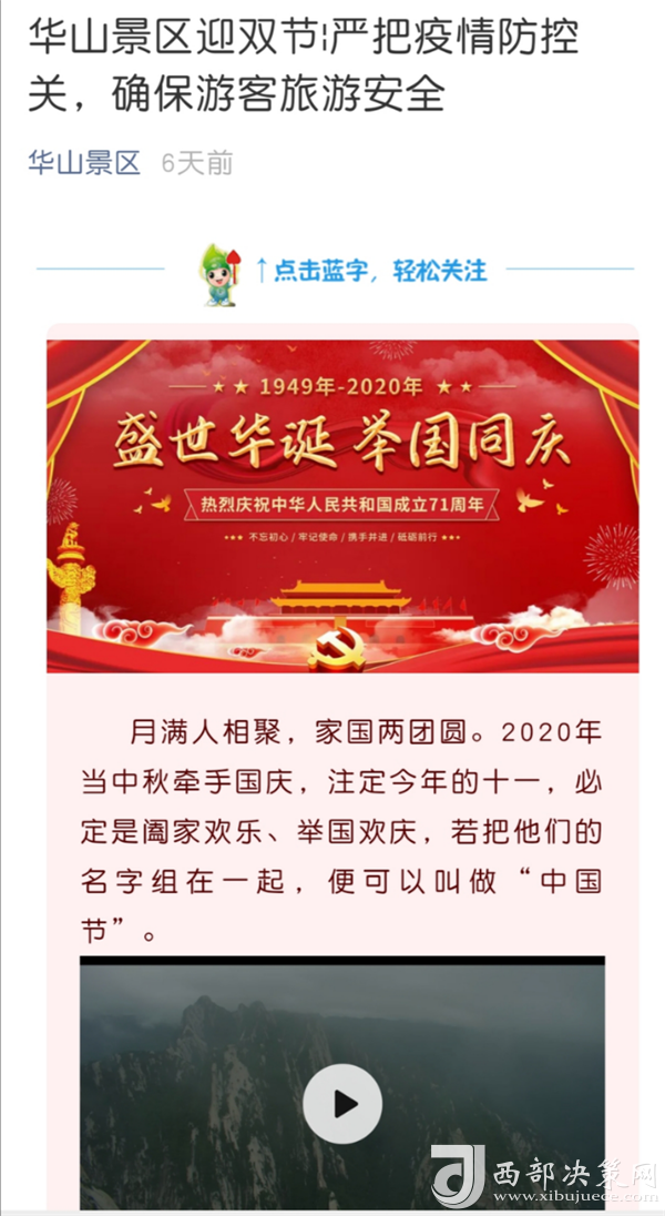 9月30日至10月8日期間,景區(qū)官方微信以歡度雙節(jié)、防疫安全、熱心服務(wù)、旅游攻略等為主題發(fā)布宣傳軟文23篇,累計(jì)閱讀量4.2萬人次,分享及轉(zhuǎn)發(fā)量共計(jì)1430次;官方微博向游客及時(shí)發(fā)布景區(qū)天氣、客流、景色實(shí)況、溫馨提示等景區(qū)度節(jié)綜合信息共計(jì)102條,閱讀量高達(dá)101.9萬次,并耐心、細(xì)致解答網(wǎng)友私信、評論共計(jì)532條;通過抖音平臺發(fā)布景區(qū)公告、秋日美景、好人好事等短視頻及圖片錦集共計(jì)18條,播放量共計(jì) 1.4萬次。