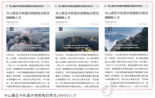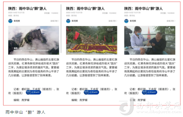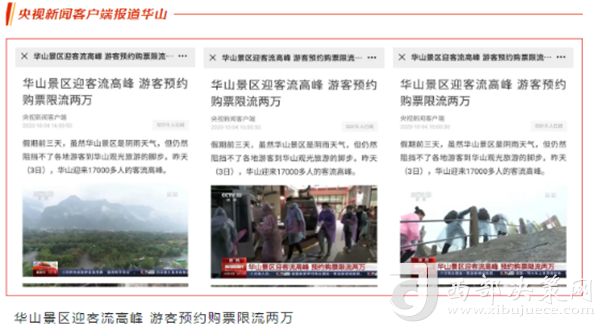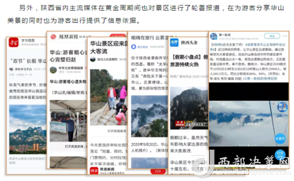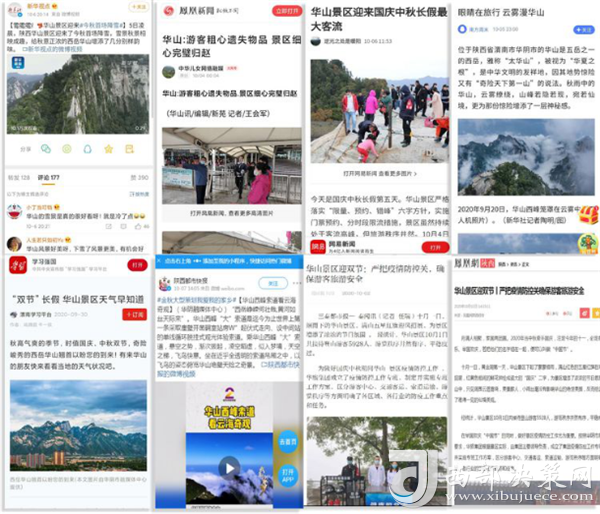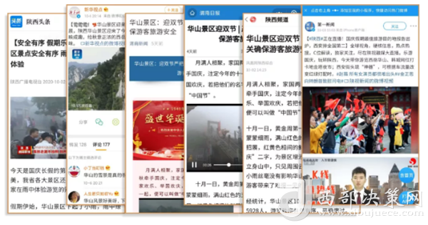 度節(jié)期間,通過央視cctv2【天下財(cái)經(jīng)】、cctv4、cctv13【新聞30分】、cctv13【新聞直播間】、央視網(wǎng)【國慶假期·出游】、央視網(wǎng)學(xué)習(xí)強(qiáng)國、央視新聞客戶端、新華社等國家級媒體對景區(qū)度節(jié)工作、游覽秩序、特色服務(wù)等方面進(jìn)行轟炸式報(bào)道;聯(lián)合陜西日報(bào)、陜西電視臺、渭南日報(bào)、渭南電視臺、三秦都市報(bào)、陜西旅游資訊、騰訊網(wǎng)、新浪網(wǎng)、網(wǎng)易陜西、鳳凰陜西等30余家主流媒體對景區(qū)度節(jié)期間各項(xiàng)工作及實(shí)時(shí)風(fēng)景進(jìn)行跟蹤報(bào)道,共計(jì)發(fā)布各類宣傳稿件239篇,全面提升景區(qū)旅游熱度。