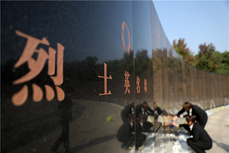 9月27日,沈陽(yáng)抗美援朝烈士陵園工作人員在擦拭烈士英名墻。新華社記者姚劍鋒攝