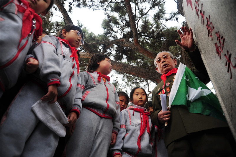 在沈陽(yáng)抗美援朝烈士陵園,志愿軍老戰(zhàn)士李維波(左一)向?qū)W生們講述邱少云的英雄事跡(2014年4月3日攝)。新華社發(fā)(張文魁攝)