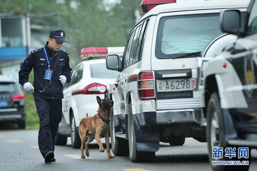 車(chē)輛搜爆項(xiàng)目中,警犬正在搜尋。新華網(wǎng)發(fā)