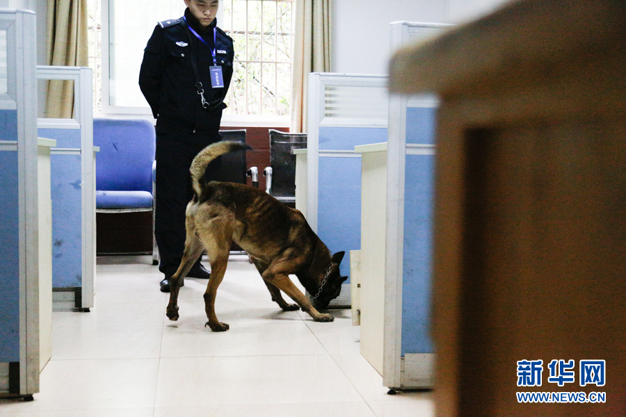 警犬正在房間內(nèi)搜索可疑物品。新華網(wǎng)發(fā)(耿駿宇 攝)