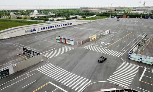 測試車輛在上海浦東新區(qū)臨港智能網(wǎng)聯(lián)汽車綜合測試示范區(qū)內(nèi)進(jìn)行行駛測試(7月3日攝,無人機(jī)照片)。新華社記者 方喆 攝