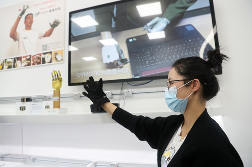 在上海張江人工智能島內(nèi),工作人員在展示“智能神經(jīng)仿生手”(11月3日攝)。新華社記者 丁汀 攝
