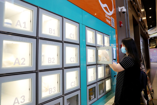 一位顧客通過APP掃碼,在上海地鐵13號線世博會博物館地鐵站附近的一家盒小馬服務(wù)點(diǎn)取餐柜中拿取預(yù)定的早餐(7月17日攝)。新華社記者 方喆 攝