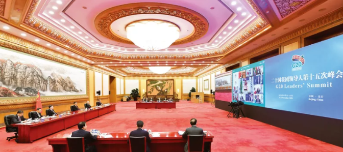 △2020年11月,習近平以視頻方式出席二十國集團領導人第十五次峰會第二階段會議,重點闡述關于可持續(xù)發(fā)展問題的看法。