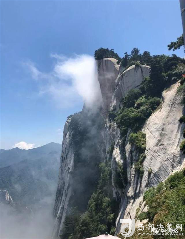 整個西峰為一塊渾然天成的巨石,北面臨空,懸崖絕壁如刀削鋸截,東西兩側狀如蓮花,因此也稱“蓮花峰”,這里更是“劈山救母”、“寶蓮燈”等傳說故事的發(fā)生地。