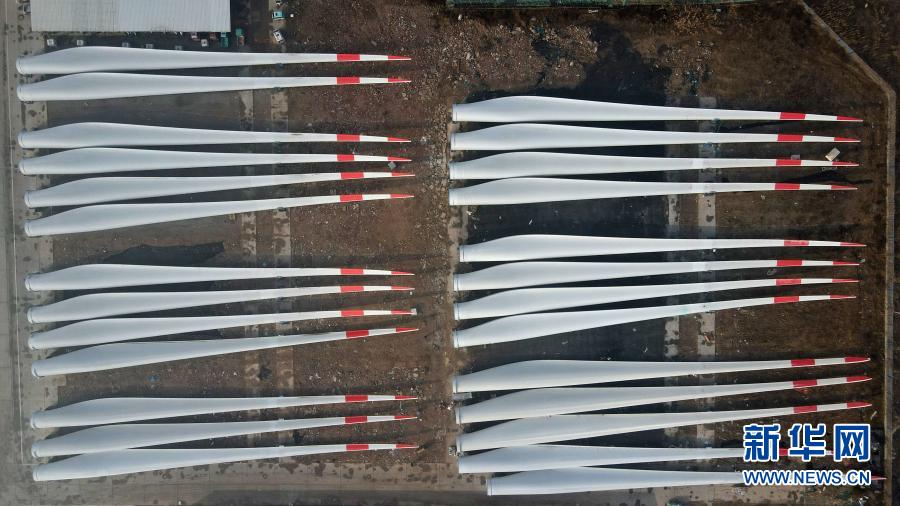 這是河北省威縣一家風(fēng)電設(shè)施生產(chǎn)企業(yè)內(nèi)的大型風(fēng)電機(jī)組葉片(12月8日攝,無人機(jī)照片)。新華社記者 牟宇 攝