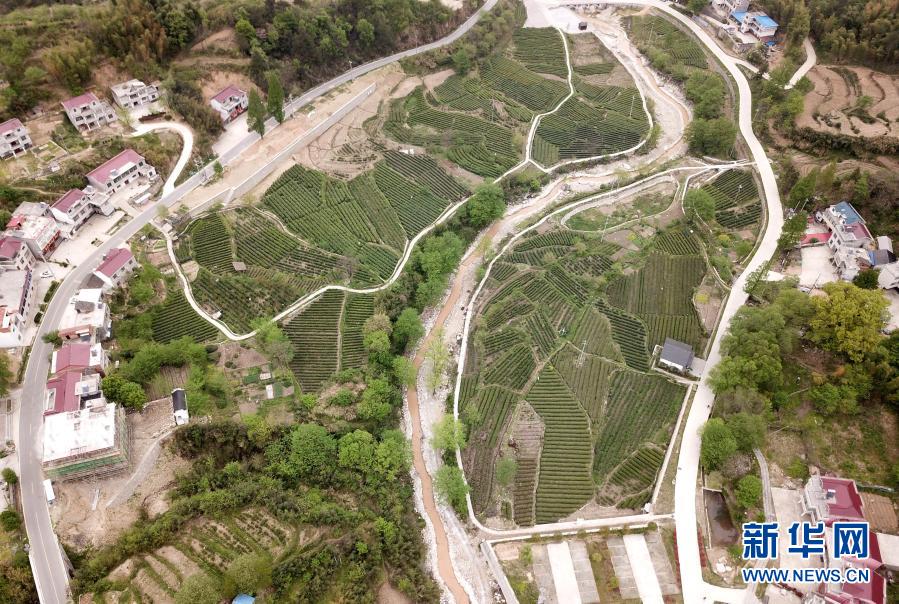 這是2020年4月17日拍攝的金寨縣花石鄉(xiāng)大灣村的茶產(chǎn)業(yè)扶貧基地(無人機照片)。新華社記者劉軍喜攝