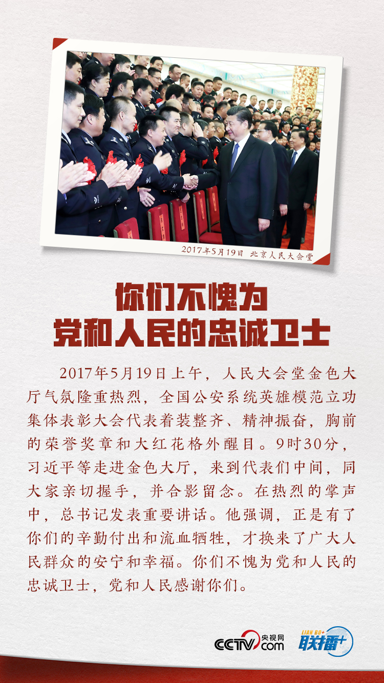 一直以來,習(xí)近平總書記對(duì)政法工作、對(duì)人民警察隊(duì)伍高度重視。黨的十八大以來,總書記多次會(huì)見全國(guó)公安系統(tǒng)的英模代表,多次到基層看望慰問人民警察,在不同場(chǎng)合多次表達(dá)對(duì)這支隊(duì)伍的關(guān)心關(guān)愛。央視網(wǎng)《聯(lián)播+》欄目特選取六幅珍貴畫面,結(jié)合總書記相關(guān)重要講話,為您展示人民領(lǐng)袖對(duì)人民警察的深情厚望。