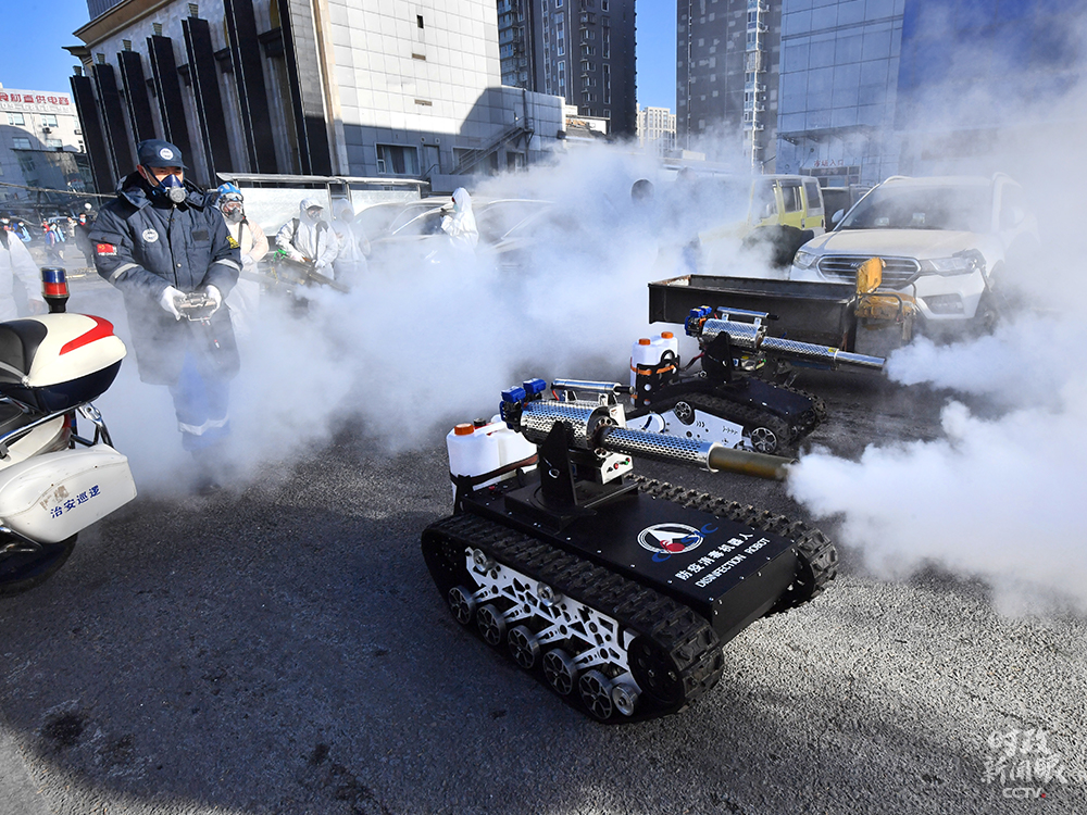 △1月9日,北京岳各莊市場,2臺“坦克”防疫消殺機(jī)器人對市場進(jìn)行消殺。這種消殺“新裝備”裝有大容量藥壺,每小時消殺約10000平方米。