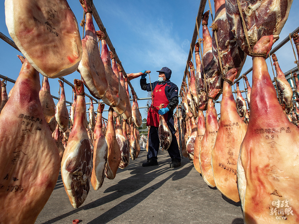 △1月10日,浙江金華某火腿加工區(qū)整整齊齊吊曬著上萬只火腿。
