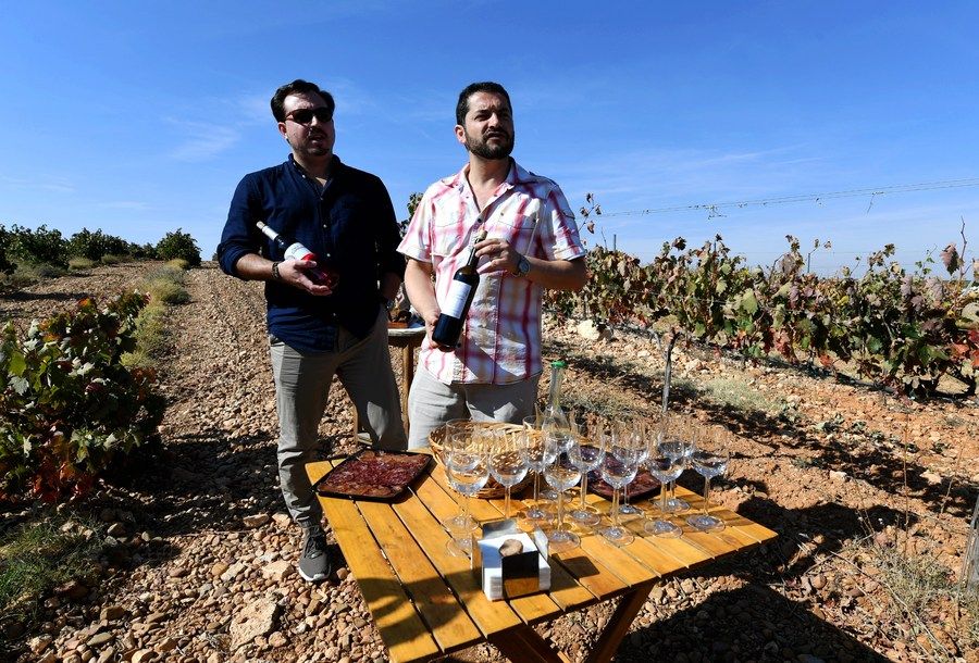 2017年9月24日,在西班牙葡萄酒產(chǎn)區(qū)巴亞多利德市的一處葡萄園內(nèi),兩名村民在展示當(dāng)?shù)蒯劸频钠咸?。這里的葡萄酒有一部分會(huì)通過“義新歐”班列出口到中國。新華社發(fā) (郭求達(dá) 攝)